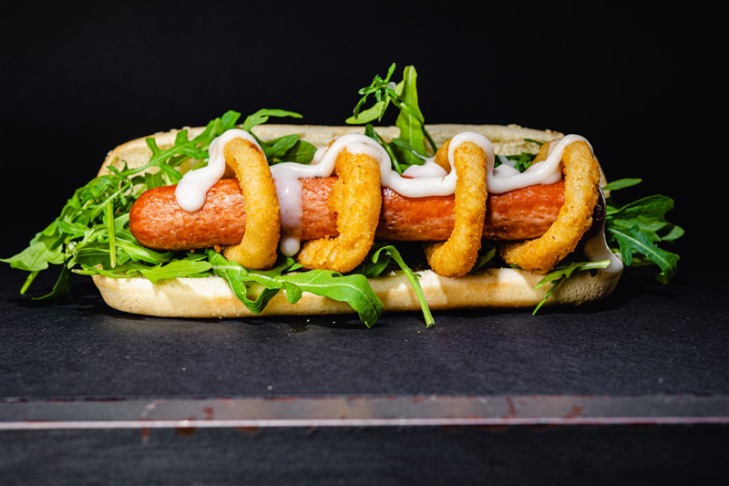 UN HOTDOG 21: Wurstel, rucola, anelli di cipolla, salsa yogurt (servito con patatine classiche*)